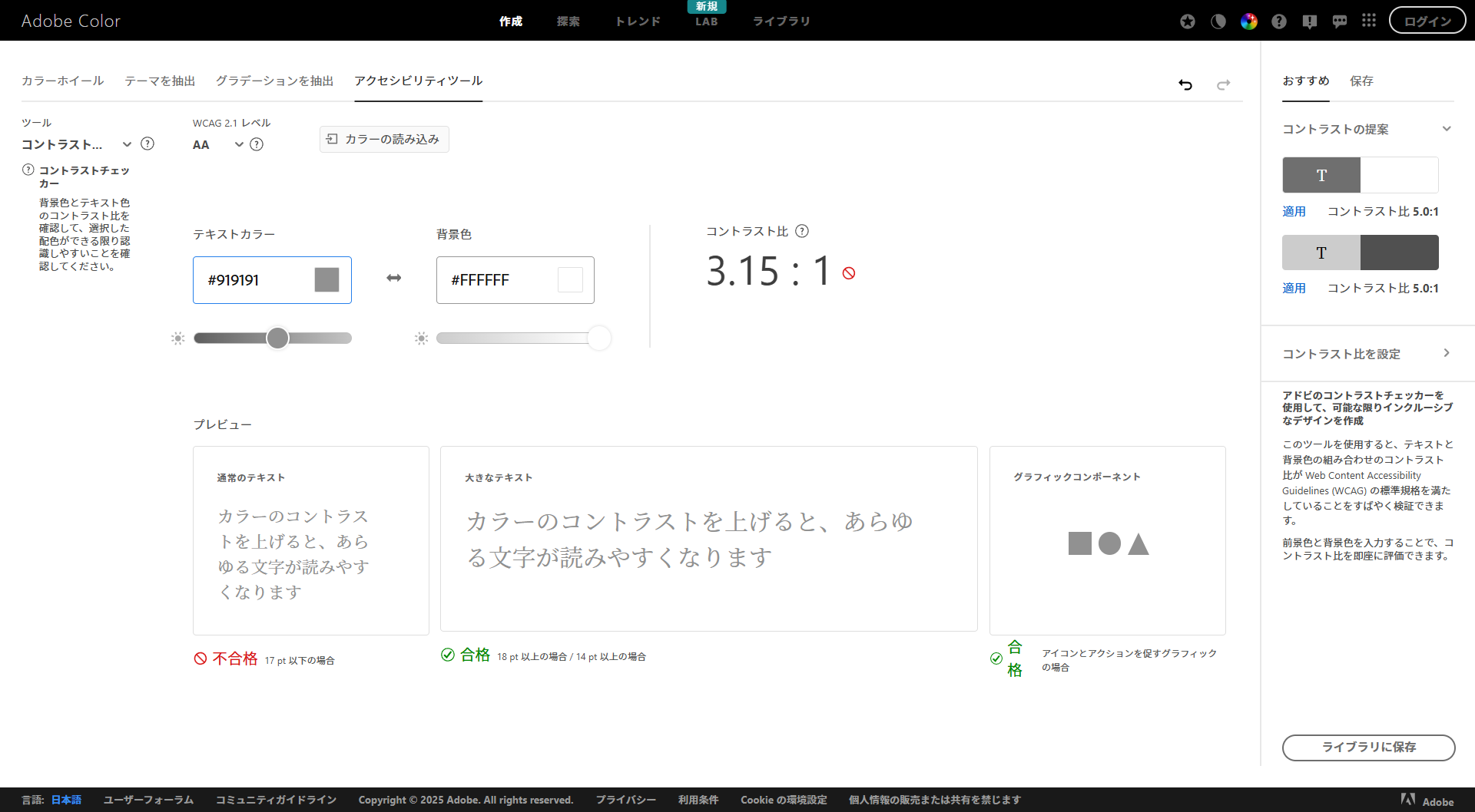 ・コントラストチェック: 「背景の色」と「文字の色」をツールに入れるだけで、読みやすいかどうかを判定してくれます。