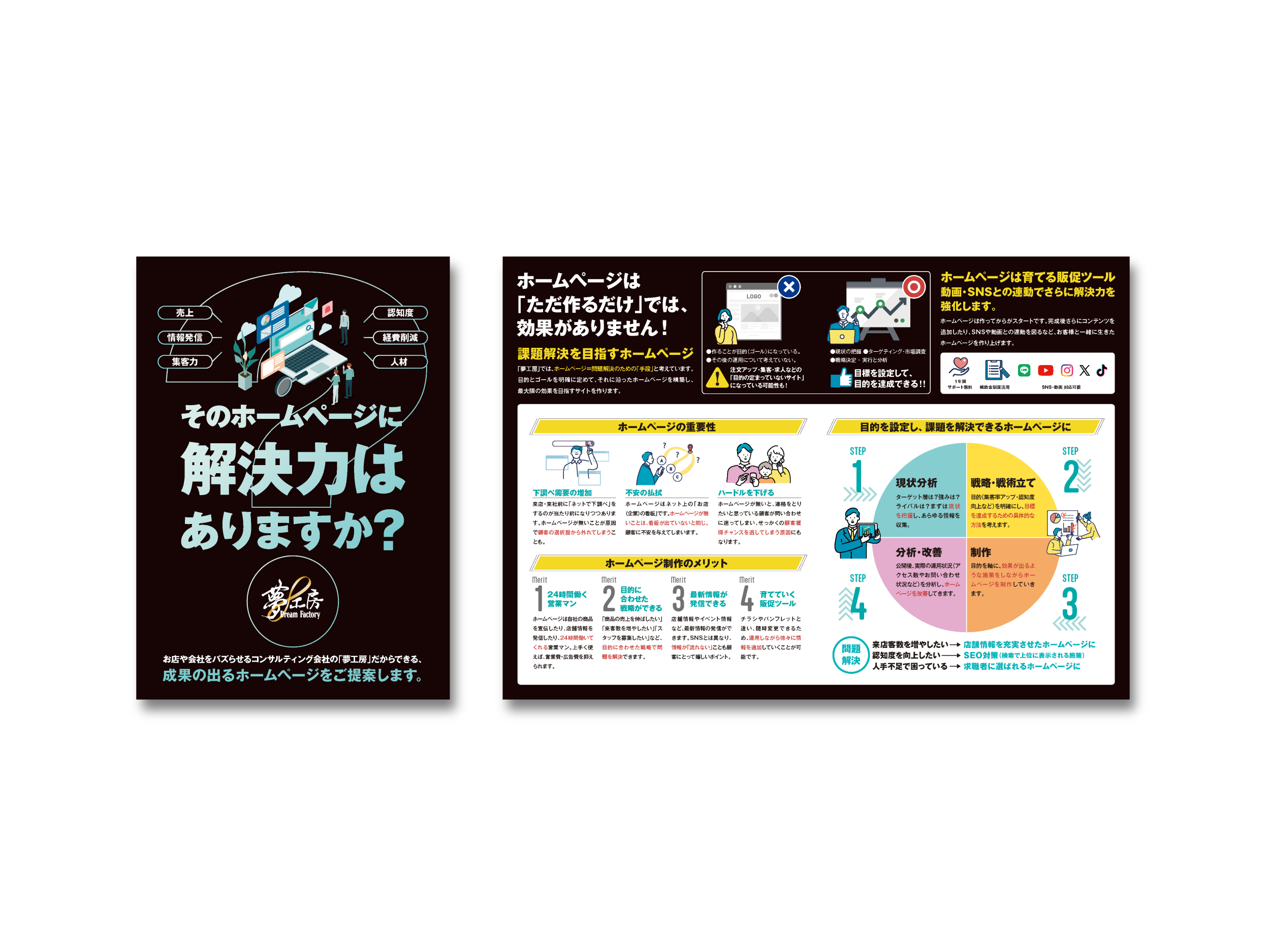 補助金制度の活用を周知するための、お客様向け両面チラシを作成。自社資料は社内で作成しております。
