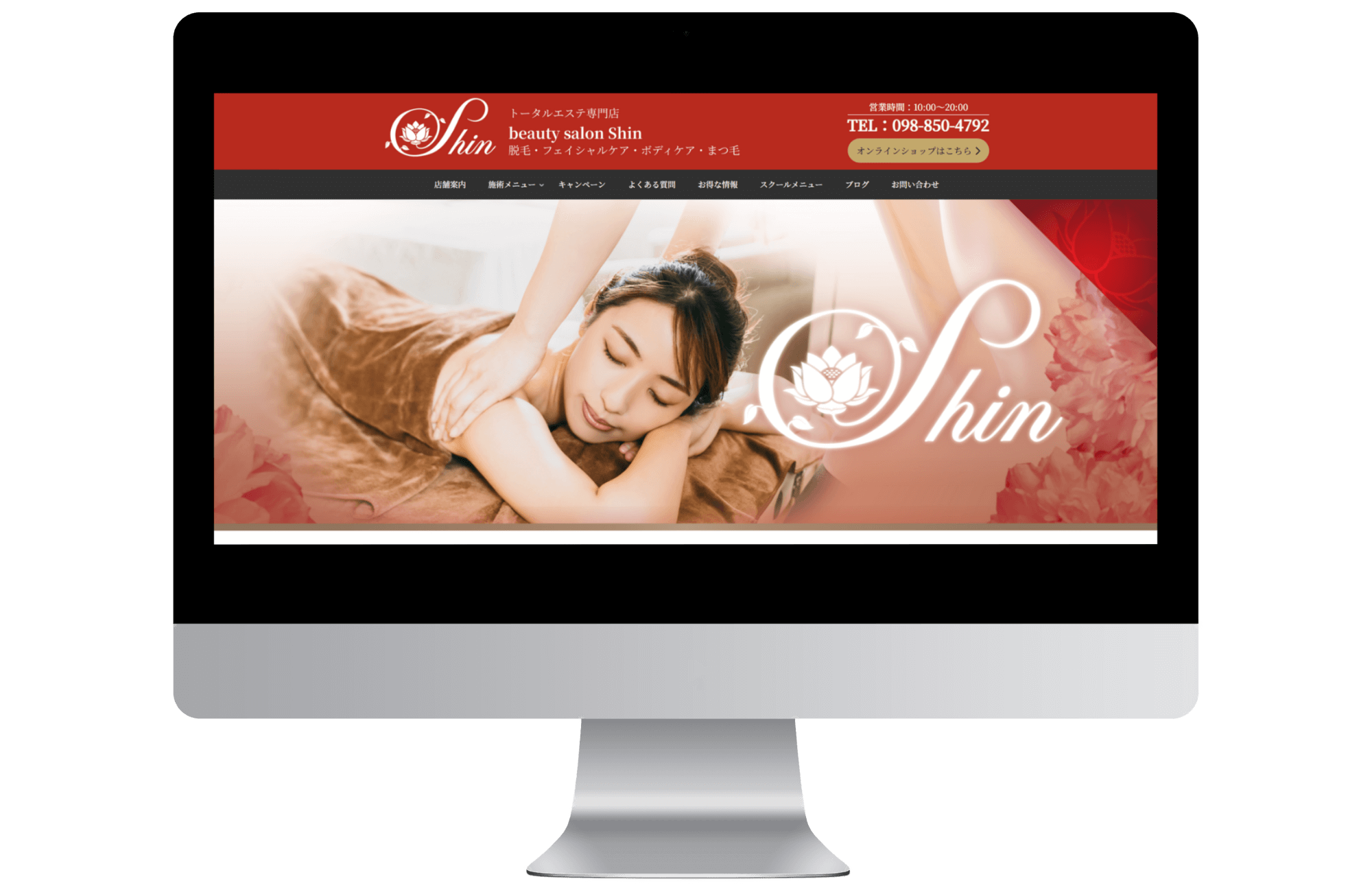 沖縄県豊見城市にあるエステ専門店ビューティーサロンShin様。金色を入れることで上質な空間に包まれるような雰囲気を表現。モバイルフレンドリー対応。